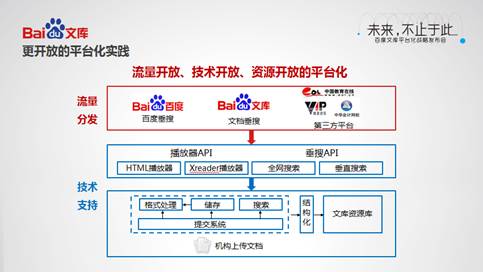 不仅如此,百度文库提供行业领先的技术资源,通过开放技术接口,提供文档的多格式智能转化技术等,将帮助合作伙伴快速搭建和完善基础资源,实现各资源平台的无缝对接。目前百度文库已经与众多省、市、校已有的信息平台融合,不需要重复搭建资源平台,在极大地节约了平台搭建资金的同时,实现了教育资源全网络共享,有力地打破了教育资源壁垒。