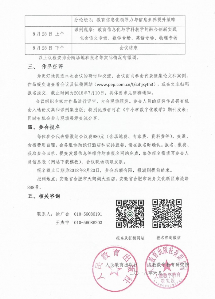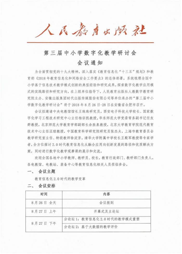 为深入落实《教育信息化“十三五”规划》、《教育信息化#行动计划》总体部署,全方位探讨教育信息化#时代的教学变革,人民教育出版社人教数字教育研究院邀请教育领域知名学者于2018年8月26—28日在安徽合肥召开“第三届全国中小学数字化教学研讨会”。现将通知转发给你们,请根据文件要求组织有关学校参会。