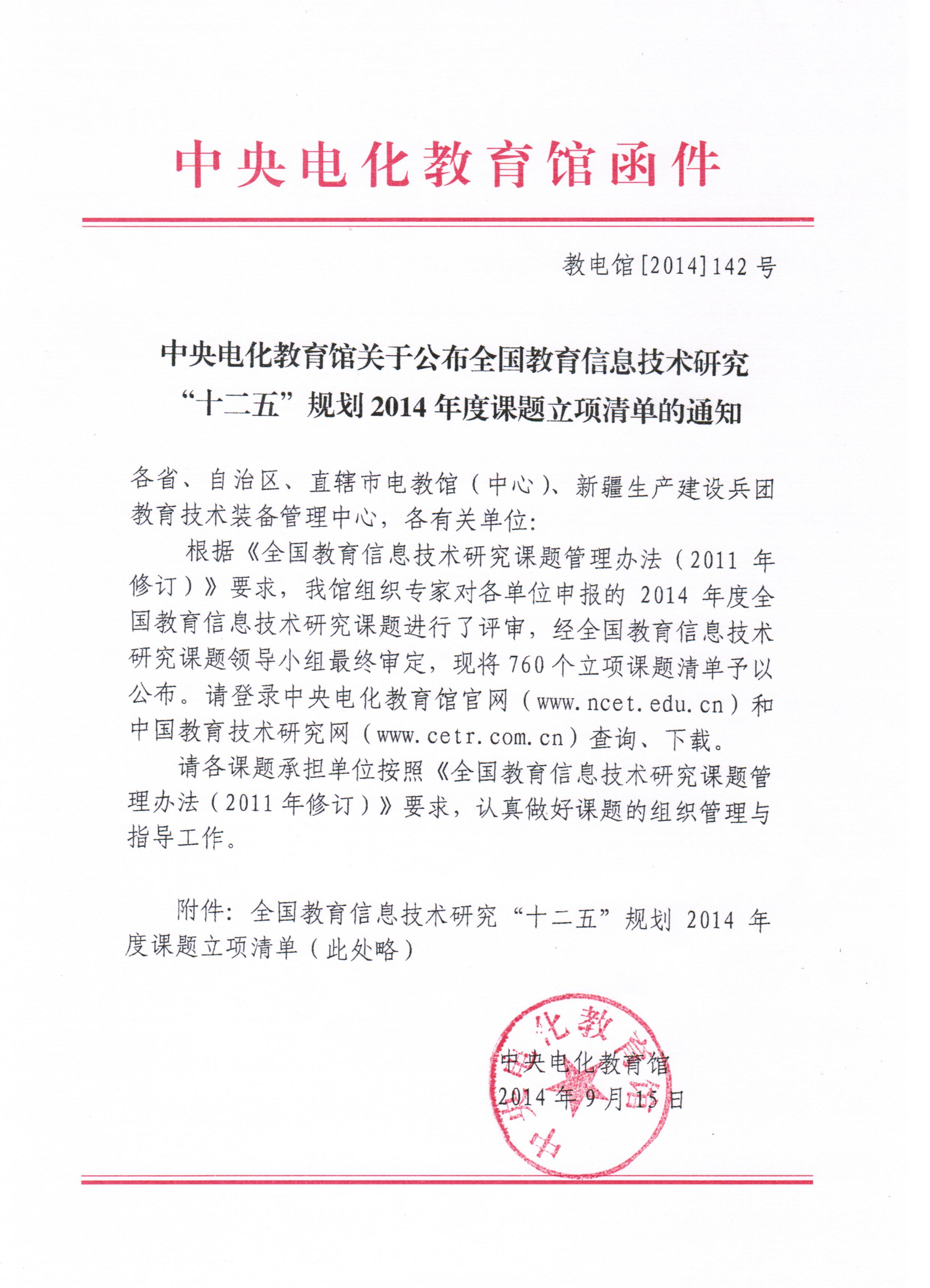 河南省电化教育馆转发《中央电化教育馆关于公布全国教育信息技术研究 “十二五”规划2014年度课题立项清单的通知》