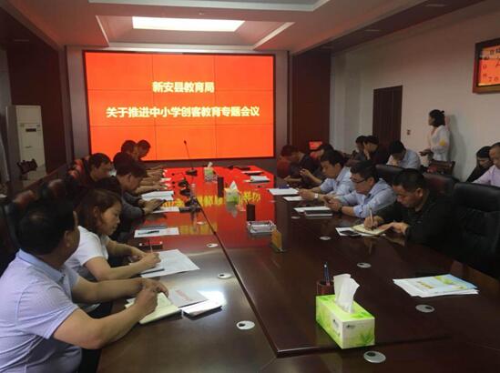 新安县教育局关于推进中小学创客教育的专题会议于5月24日下午在县教育局3楼会议室召开。局直各中小学校业务副校长、各镇中心校的电教专干近30人参加了会议。