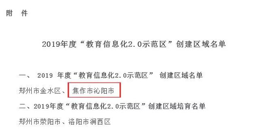 近日,河南省教育厅公布《关于公布2019年度教育信息化2.0示范区创建区域名单的通知》,其中,沁阳市成功当选“2019年度教育信息化2.0示范区创建区域”。