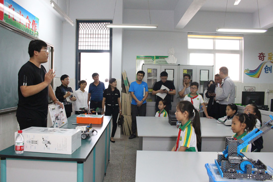 3D打印教室里,负责老师详细介绍了课程设计和实施进展,并针对课程开展的相关困惑请教了省创客教育检查组的同志。机床班赵老师正在用学校自编创客校本教材进行机床教学,孩子们熟练地操作着各种机床。检查组来到机器人教室,同学们正在认真地组装机器人,体验科技智慧带来的快乐。