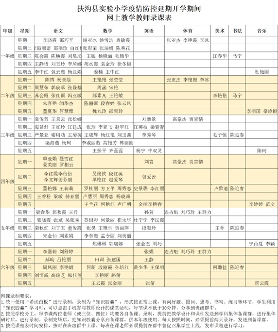 附件1:扶沟县实验小学疫情防控延期开学期间网上教学教师录课表